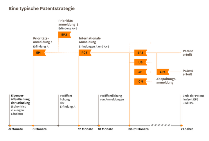 Wenn Sie in mehreren Ländern Patentschutz erlangen möchten, ist es nicht erforderlich, direkt in den verschiedenen Ländern Patentanmeldungen einzureichen. In der Regel beginnt eine Anmeldestrategie mit einer ersten Patentanmeldung, die als Prioritätsanmeldung bezeichnet wird. In der folgenden Darstellung ist dies die europäische Anmeldung EP1, in der die Erfindung A beansprucht wird. Nach Einreichung der Prioritätsanmeldung können Sie innerhalb von zwölf Monaten eine oder mehrere Folgeanmeldungen einreichen, in denen Sie die Priorität der ersten Anmeldung in Anspruch nehmen. Das Datum, an dem die Prioritätsanmeldung eingereicht wurde, gilt somit als maßgebliches Datum für die Beurteilung der Neuheit und der erfinderischen Tätigkeit der Folgeanmeldung. In der Grafik hat die Veröffentlichung der Erfindung A während des Prioritätsjahres somit keinen Einfluss auf die Beurteilung von EP1 oder Folgeanmeldungen.